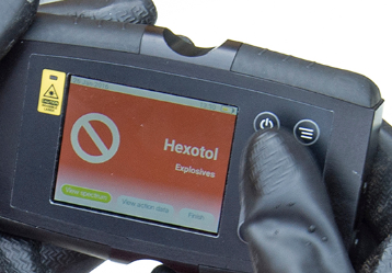 The handheld explosive detector utilizes Raman technology to quickly identify solid and liquid chemical substances.
