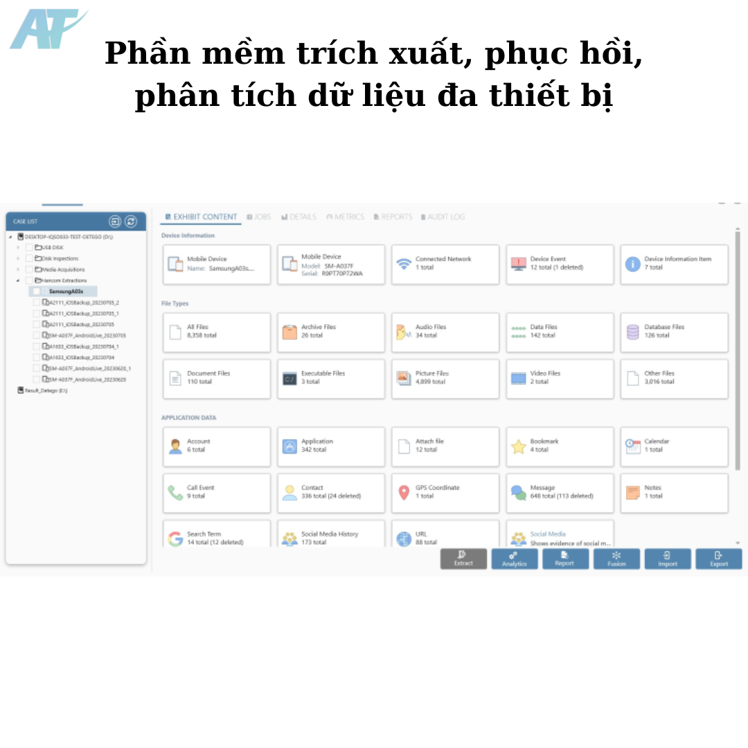 - Trích xuất, phân tích và báo cáo dữ liệu đa thiết bị: Hệ thống có thể trích xuất, phân tích và báo cáo dữ liệu từ nhiều thiết bị khác nhau bao gồm máy tính, điện thoại, thiết bị thông minh, thiết bị lưu trữ, máy bay không người lái, ổ cứng máy tính, ổ cứng di động, USB, USIM, Google. Nó có khả năng khai thác dữ liệu và thông tin chi tiết từ hơn 2.000 ứng dụng.