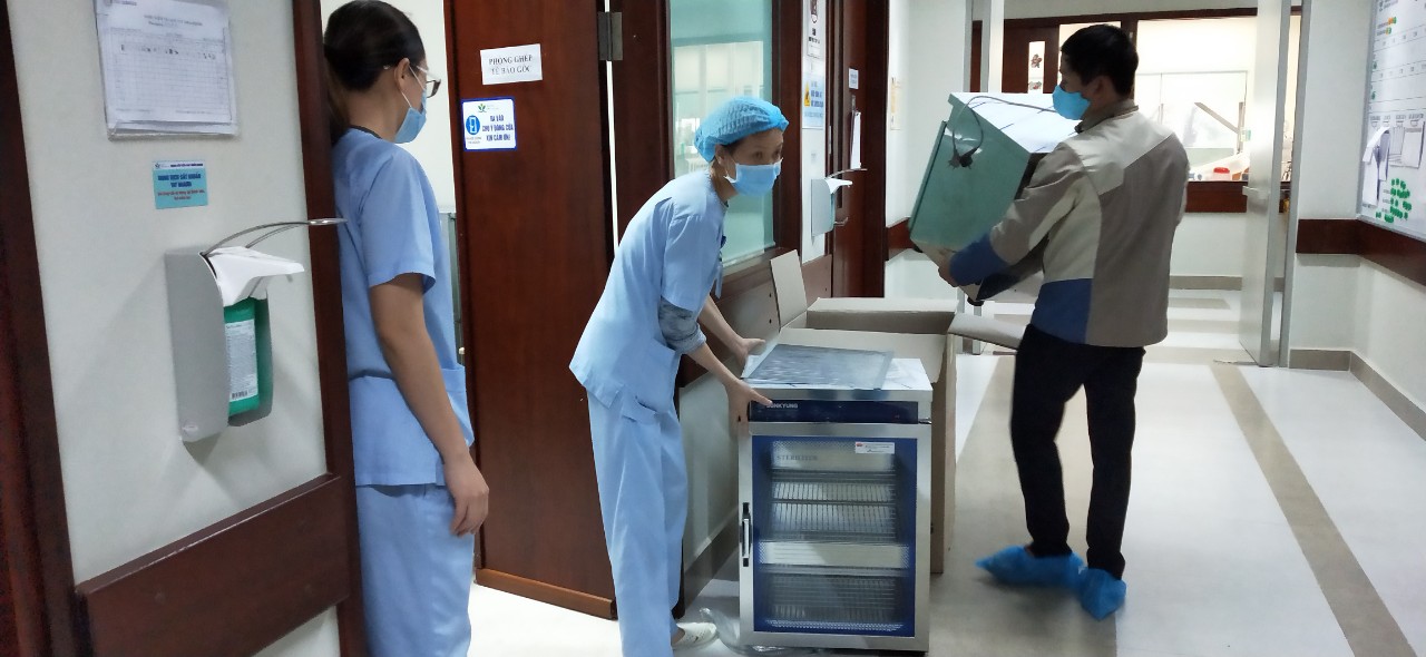 Cụ thể tủ tiệt trùng bằng tia UV + nhiệt độ ( Sấy khô) model SKHP-N302,SK-302HU của hãng Sunkyung Hàn Quốc được trang bị cho các phòng ban để tiệt trùng tiền và tài liệu đang lưu hành trong ngân hàng.